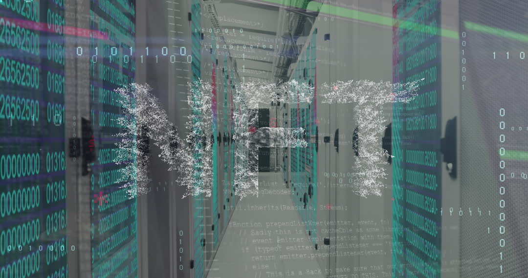 This visual concept merges the high-tech environment of server rooms with the modern world of NFTs, suggesting robust data management and blockchain integration in digital services. Suitable for illustrating topics in technology articles, IT services, blockchain, and contemporary digital trends.