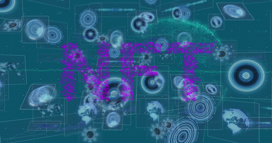 Colorful digital animation showcasing encryption and digital asset technology with 'NFT' text. Ideal for presentations and articles on blockchain and digital collectibles. Suitable for illustrating technological advancements and global data networks.