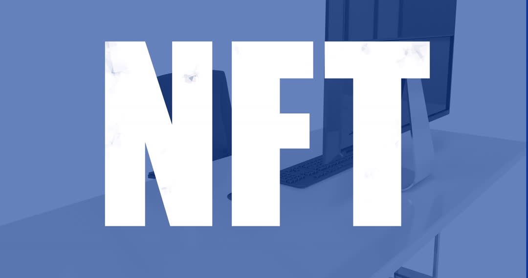 NFT concept artwork featured over a 3D model of a modern office desk. Perfect for illustrating articles or marketing about cryptocurrency, digital art, or blockchain technology. Useful for bloggers, technology companies, and financial sectors seeking visuals on modern finance topics.