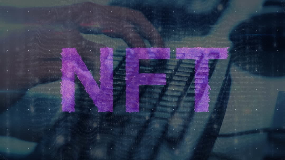 Dynamic visual representing the non-fungible token (NFT) and blockchain technology concept with typing hands overlaid with graphic text. Suitable for articles and marketing materials related to NFTs, cryptocurrency trends, digital art sales, and technological advances in blockchain sectors, as well as presentations on digital transformation and future tech innovations.
