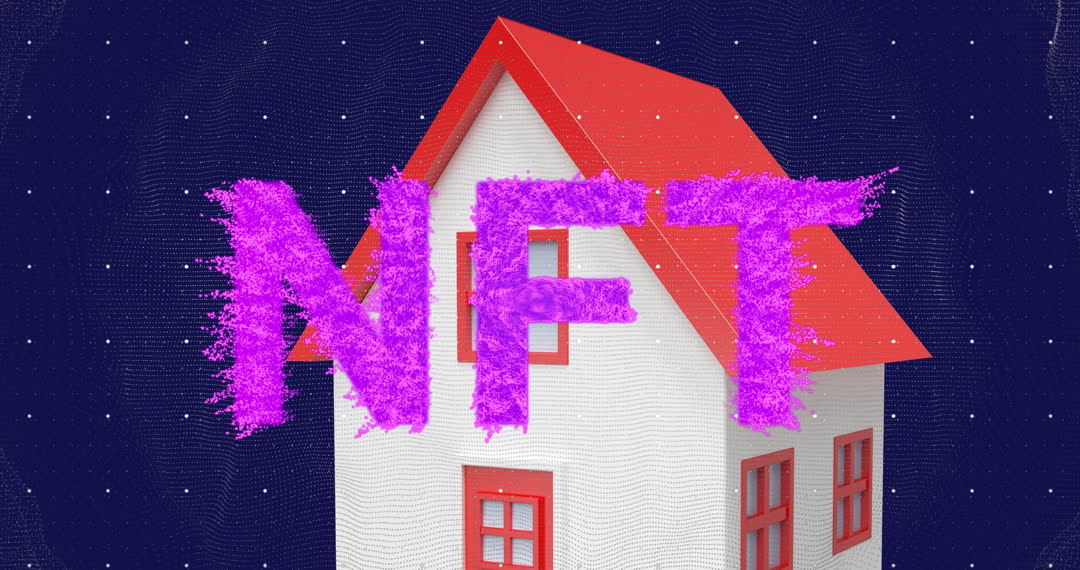 This illustration features an NFT-themed backdrop highlighting a house alongside stylized digital lettering. The combination signifies the intersection of real estate and digital art, reflecting the rising trend of NFTs in the modern technological landscape. Ideal for use in presentations, educational materials about blockchain technology, or articles discussing the integration of NFTs in everyday aspects and investments.