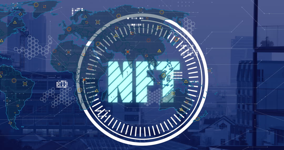 - NFT Technology Overlay on Global Map with Cityscape Background