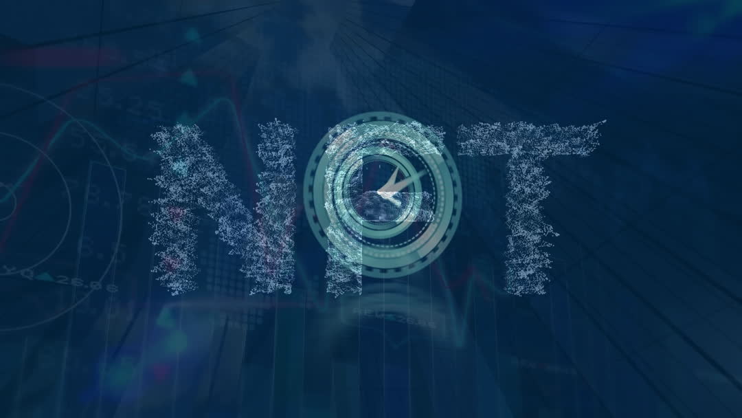 - NFT Text with Moving Clocks Over Digital Data Visualization