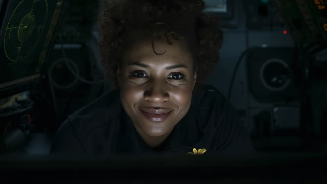 AI Generated Image. Close-up video clip showing female technician smiling while monitoring radar glow on console, low-key lighting highlighting facial features and yellow uniform badge. Camera framing holding attention on facial expression and screen reflection, creating cinematic, human-centered tech mood. Use for corporate technology promos, cybersecurity presentations, aviation and maritime navigation content, emergency operations training, recruitment campaigns, website hero banners, and social media ads. Suggested edits include applying subtle color grading, adding slow push-in or gentle parallax for motion, overlaying data graphics or subtitles, and pairing with ambient electronic soundtrack. Licensing-ready clip for promotional content, internal training, editorial coverage of control room operations, and stock footage libraries.