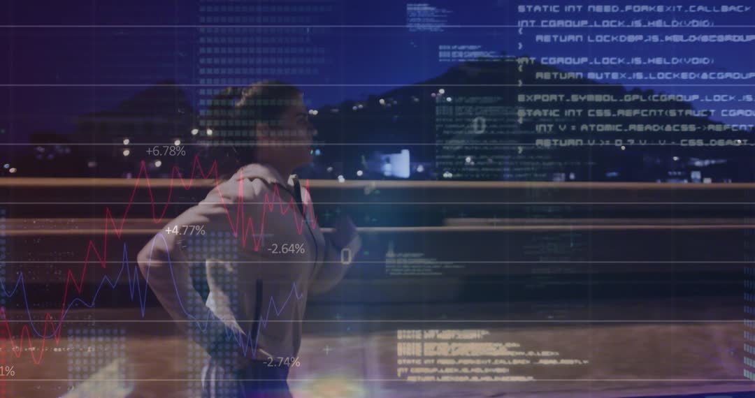Video showing female runner moving across city bridge at night while live fitness metrics and market-style data overlays scroll across frame. Overlays including line charts, percentage markers, code snippets, and HUD elements blending with motion blur and light streaks for tech-forward visual. Silhouette, streetlights, and skyline bokeh contributing urban, after-dark mood. Ideal for promoting fitness apps, showcasing wearable tech, illustrating data-driven training, enhancing fintech or health analytics storytelling, and supporting social media ads, website hero banners, broadcast packages, or corporate presentations. Color grading, slow shutter motion, and dynamic overlays supporting cinematic, futuristic branding.