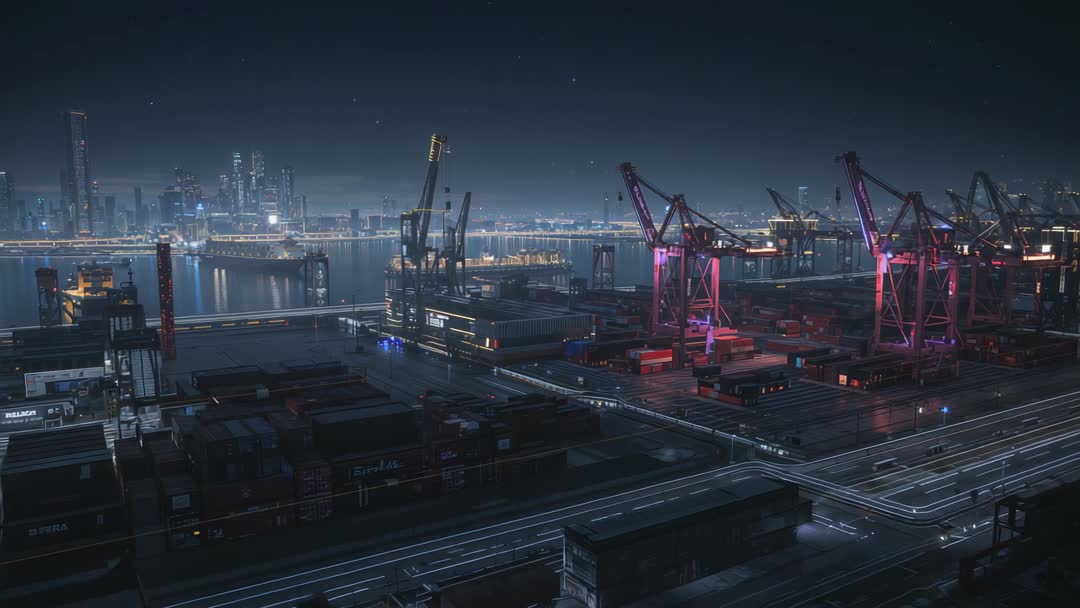 - Nighttime container terminal featuring neon-lit cranes and trucks moving through waterfront