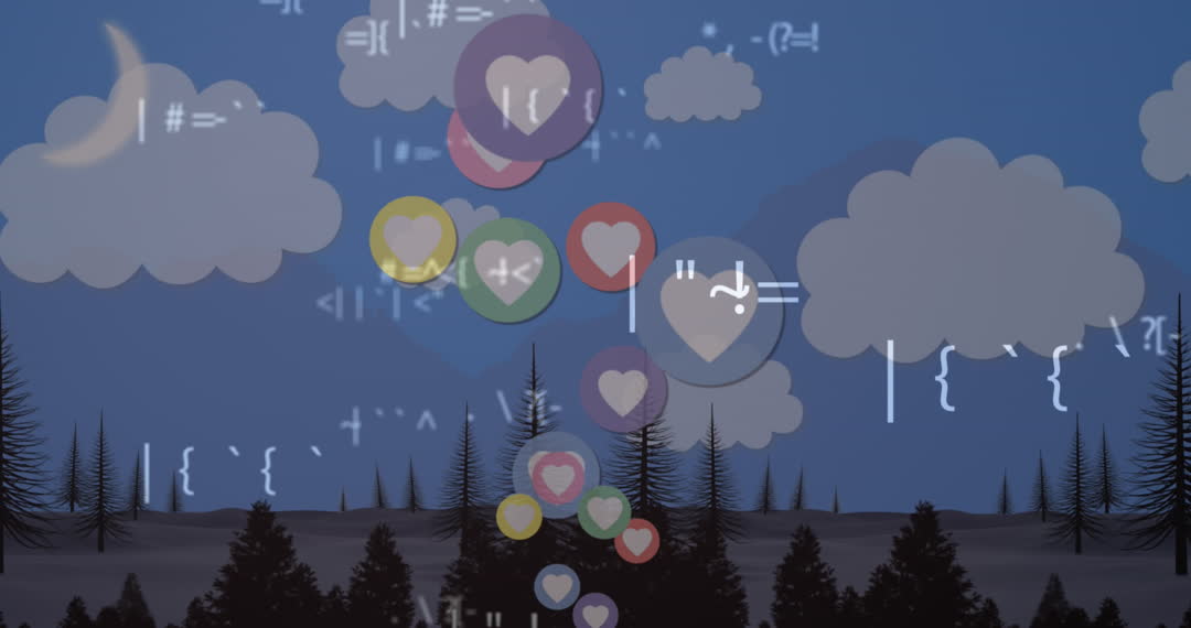 This animation features a serene nighttime forest scene with digital hearts rising towards the sky, overlaid with snippets of code. The stark contrast of the softened nature backdrop with the vivid heart icons symbolizes a forward-looking view of digital communication and technology. The code representation accentuates the modern influence and the proliferation of social media. This visual can effectively support themes related to technological influence on communication, digital engagement, and stretching the boundaries between nature and technology. Suitable for presentations and content directors aiming to promote an innovative and positive twist on digital transformation.