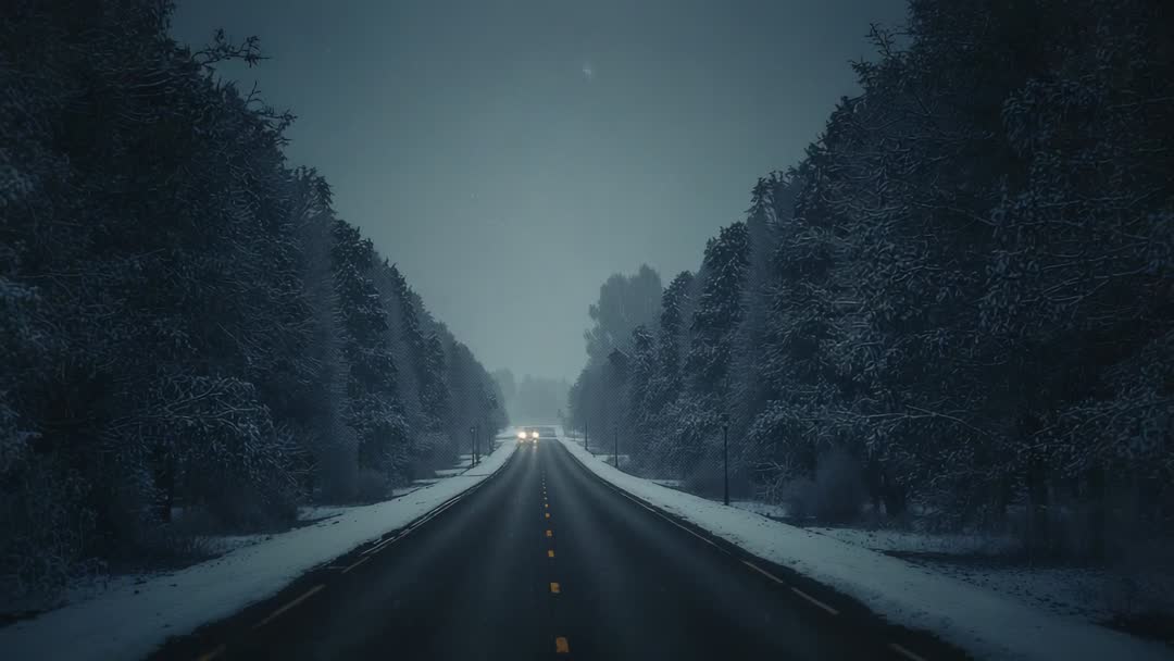 AI Generated Video. Providing moody cinematic footage showing headlights approaching along snowy two-lane road framed by snow-dusted pine trees at night. Camera tracking long straight road toward distant vehicle, creating sense of motion, anticipation, solitude. Lighting conveying cold blue tones and soft snow texture for dramatic atmosphere. Suited for thriller or suspense openers, winter travel advisories, road safety campaigns, weather segments, transport or automotive promos. Working well as website hero background, social media ad, title sequence, broadcast bumper, or looped ambient clip for retail displays and waiting areas. Delivering cinematic mood for storytelling, seasonal marketing, editorial pieces, and visual projects needing quiet, suspenseful night driving footage.