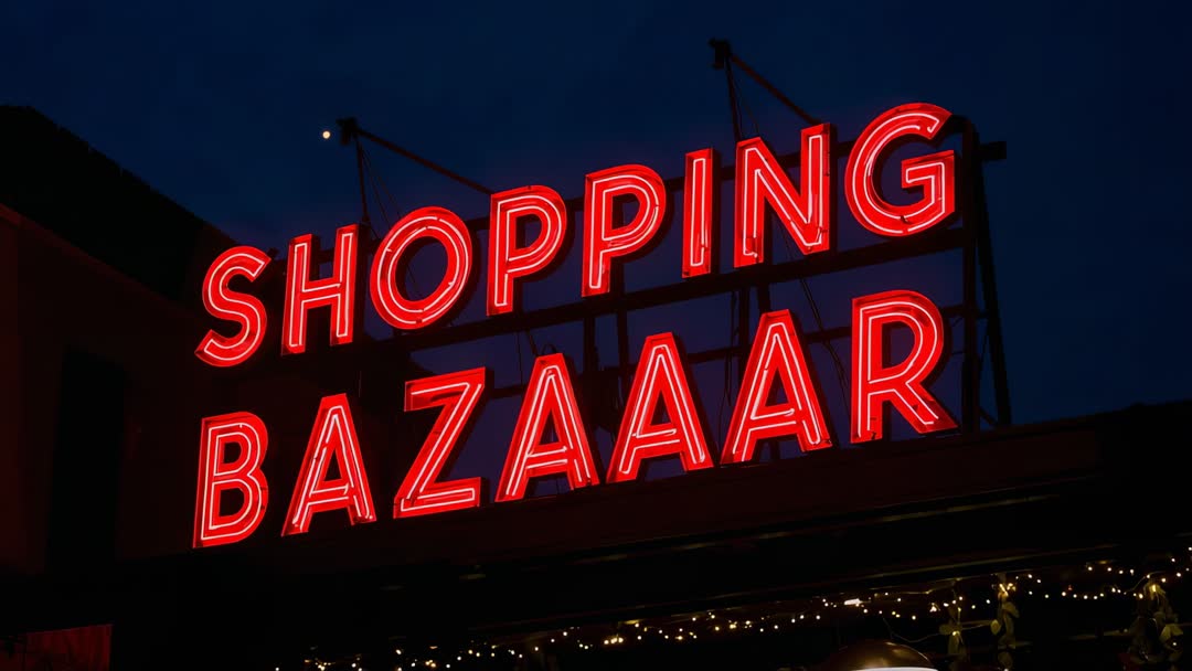 AI Generated Image. Showing neon SHOPPING BAZAAAR sign flashing against deep blue night sky, with warm twinkling lights along storefront edge. Providing bold, high-contrast footage ideal for nightlife and retail projects, social media ads, event promos, and website headers. Evoking nostalgic retro atmosphere and vibrant urban energy, supporting themes of shopping, holiday markets, and evening commerce. Allowing easy overlay of text or logo in dark negative space below sign, offering strong color contrast for dramatic color grading. Working well in editorial features, advertising campaigns, motion graphics, and background loops for digital signage.