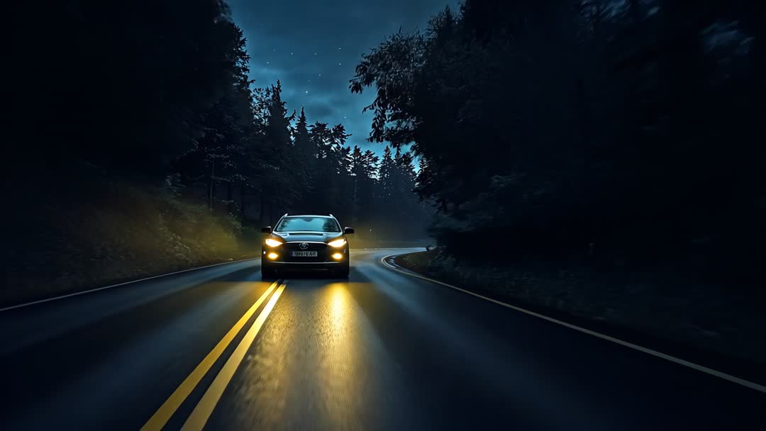 AI Generated Image. Showing nighttime SUV approaching camera on wet winding forest road, headlights casting warm beams and creating long reflections on glossy pavement and double-yellow centerline. Scene conveying cinematic tension and moody atmosphere, suitable for automotive commercials, vehicle safety campaigns, travel and adventure videos, TV drama intros, and social media promos. Footage working well as background for title overlays, lower thirds, countdowns, and dynamic transitions. Color grading friendly for teal-and-orange looks and high-contrast cinematic edits. Ideal for illustrating night driving, headlight performance, road safety messages, or adding dramatic motion to lifestyle and travel content.