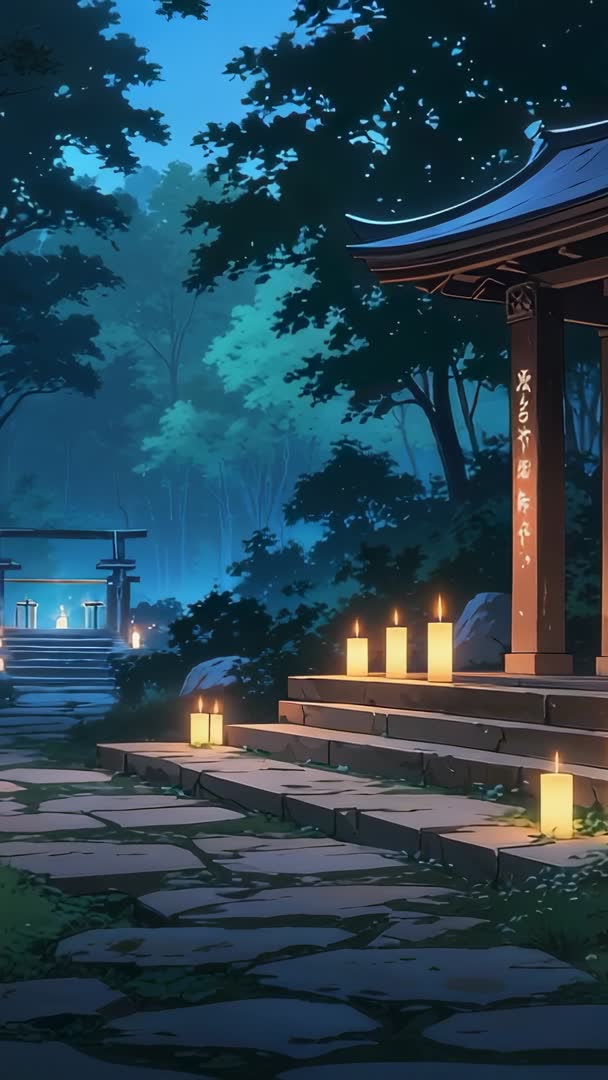 AI Generated Image. Vertical video capturing Shinto shrine steps and wooden pillar bathed in warm candlelight, creating tranquil nocturnal atmosphere. Soft flickering candles lining stone steps and pathway, guiding visual flow toward distant torii gate framed by shadowy forest. Composition leaving generous copy space for text overlays, titles, or logo placement. Suiting meditation and mindfulness videos, spiritual or cultural travel features, social media reels, and wellness app backgrounds. Working well as cinematic opener, ambient loop, guided breathing session backdrop, or promotional clip for temple events and retreats. Color palette blending deep blues and warm ambers, enhancing mood and allowing subtle typography to stand out. Recommending gentle ambient music or soft chimes to amplify calming effect and extending clip for seamless looping to maintain continuous atmosphere.