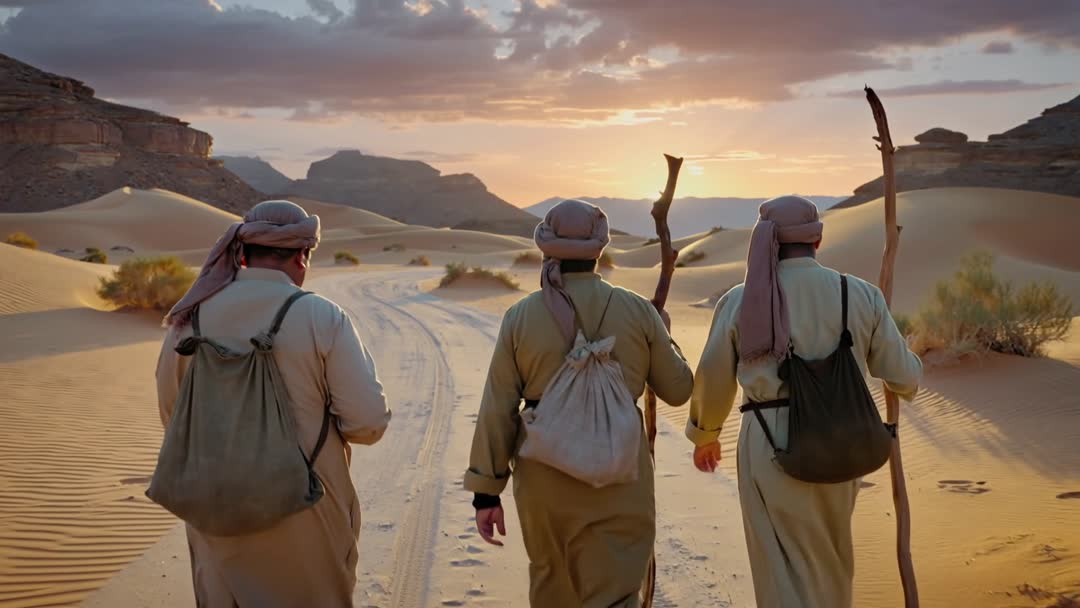 AI Generated Video. Scene showcasing three travelers dressed in traditional Middle Eastern attire walking through desert at sunset, carrying staffs and sacks. Evokes themes of adventure and exploration in a beautiful, arid landscape. Useful for projects on travel, history, culture, or depictions of life in desert regions.