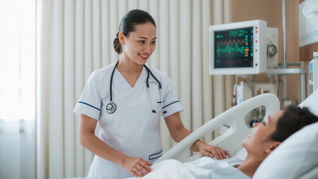 AI Generated Video. Nurse assessing patient at bedside while monitoring ECG waveform and offering reassuring touch. Video clip presenting close-up medium shot with soft natural light, clinical environment, and clear view of monitor readouts and stethoscope. Serving well for hospital websites, nursing training modules, patient education videos, healthcare marketing, medical brochures, and social media campaigns promoting compassionate care. Serving as B-roll for telemedicine, clinical simulation, electronic health record tutorials, recruitment materials for nursing staff, and patient experience storytelling. Suggested edits: adding lower third overlay for presenter name, cropping for social format, adding voiceover about patient-centered care, and color grading for warm, calming tone.