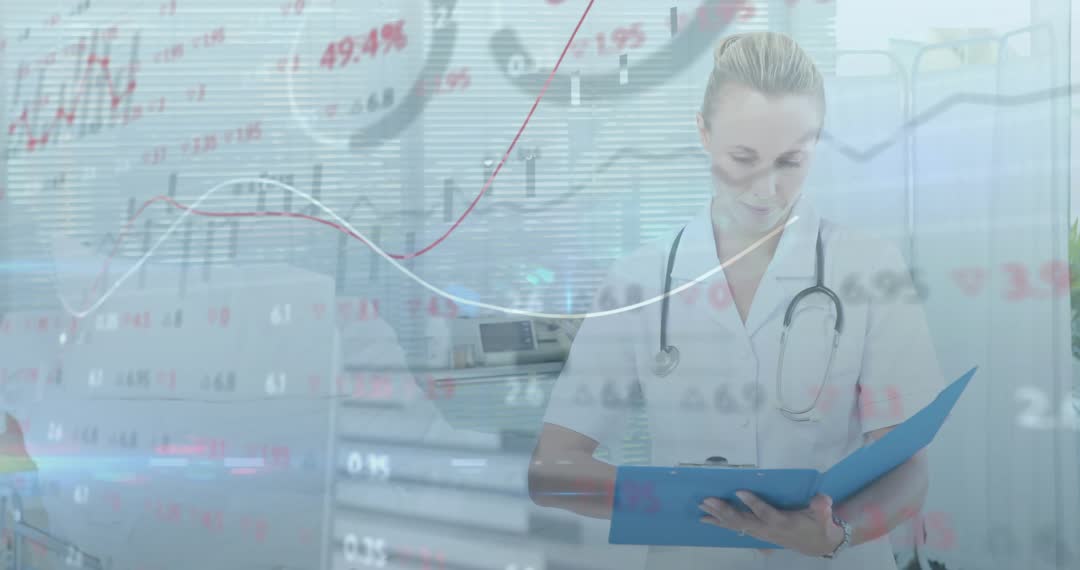 Nurse holds a chart with medical data overlaid in busy healthcare environment, focusing on data insights. This videory highlights healthcare technology merging with traditional nursing practices. Suitable for illustrating themes of innovation in medicine, data-driven healthcare solutions, nursing roles, and showcasing advanced healthcare practices.