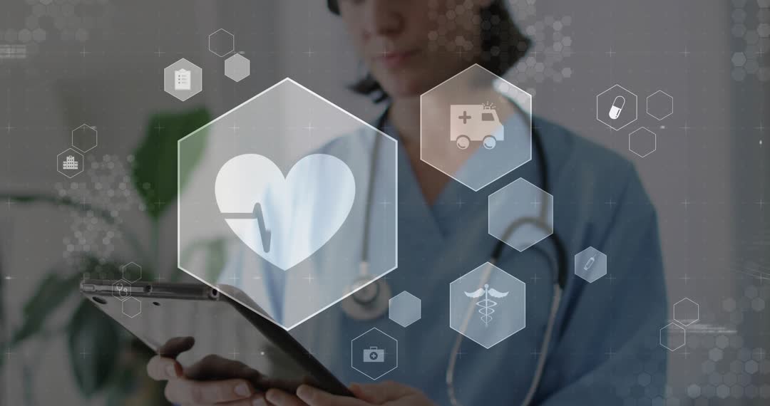 Nurse Using Digital Devices with Medical Icons Overlay for Telehealth Video