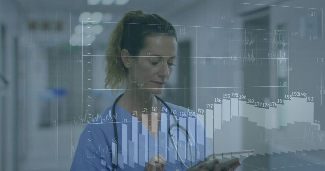 A nurse is tapping on a tablet with an overlay of data charts and graphs. This symbolizes modern healthcare integration with technology. Useful for medical technology presentations, healthcare analytics videos, and digital health promotion. Ideal for showcasing innovative patient care solutions relying on data-driven decisions.