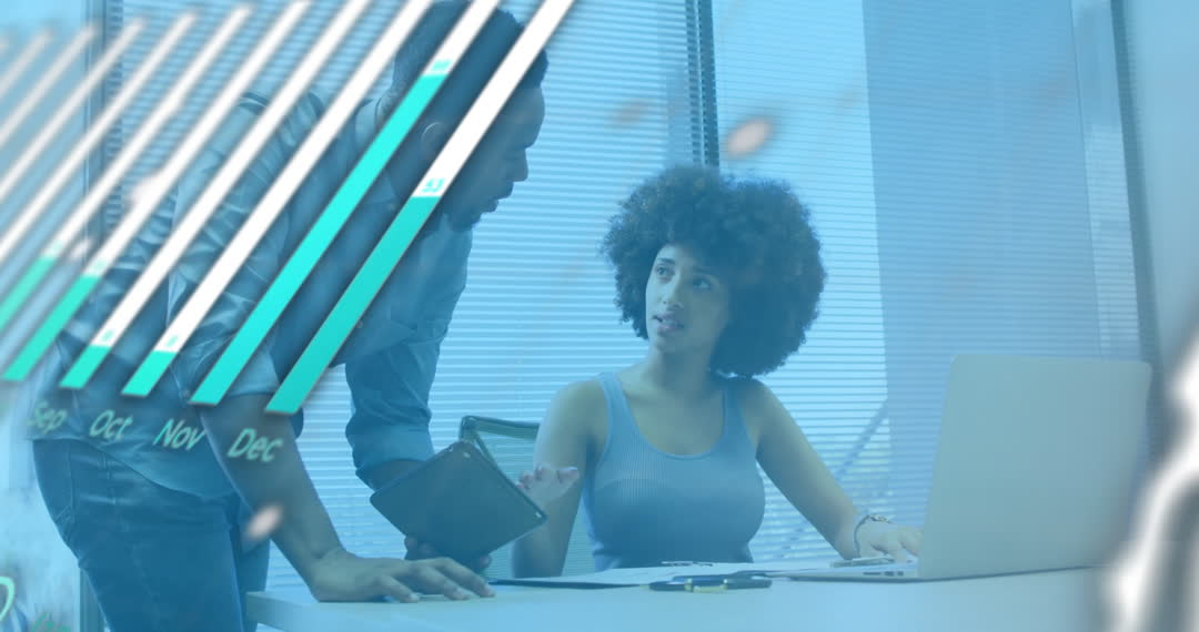 Colleagues engaging in conversation with a digital financial data overlay adds a tech-savvy dimension to the workplace dynamic. Ideal for illustrating modern business practices, digital strategy discussions, or team collaboration, this could be used in presentations, business websites, tech articles, or HR materials to emphasize diversity and innovation in the workplace.