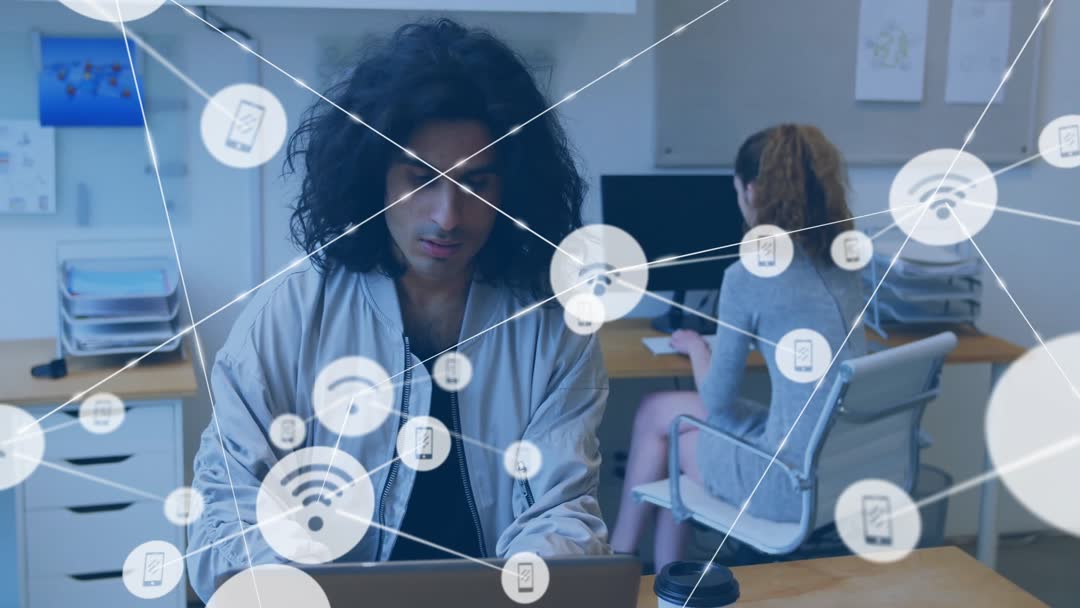 Office Connectivity Concept with Wi-Fi and Phone Icons Overlay Video