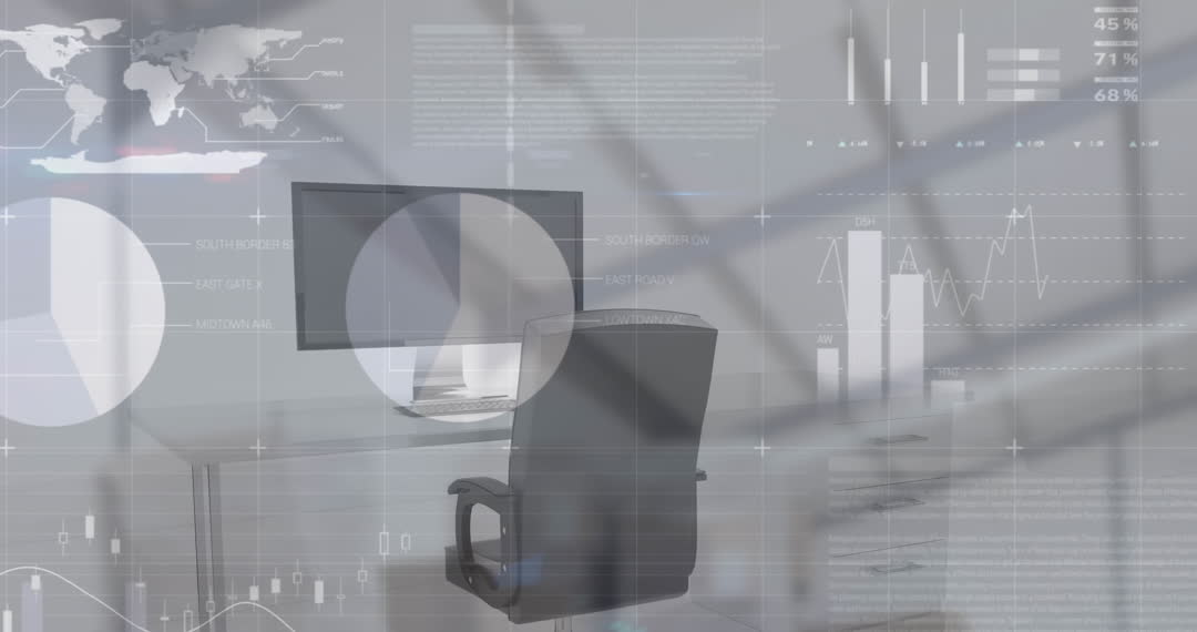 Office environment scene with a desk and computer displaying financial data and analytics overlays. Suitable for corporate, business, and financial presentations, showcasing modern analytics and data processing in a work setting.