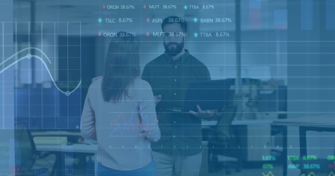 Two professionals are engaged in a business conversation with an overlay of stock market graphs and data. This visual highlights a blend of modern technology with traditional office dialogue, reflecting themes of finance, analytics, and teamwork. It can be used in articles about market trends, financial strategies, corporate environments, or technology in business.
