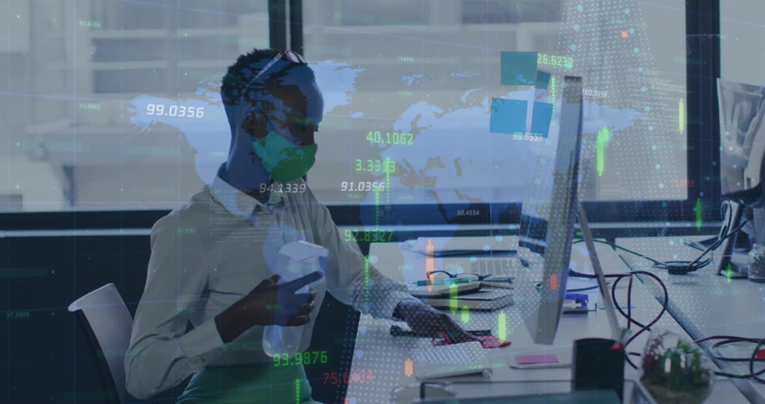 An African American woman is seen disinfecting her desk, with overlays of financial data and technology grids in the background. This highlights the importance of maintaining workplace hygiene, especially in a bustling financial or tech-oriented environment. Ideal for themes related to office cleanliness, financial workplaces, and the intersection of hygiene with organizational efficiency and modern technology readiness.