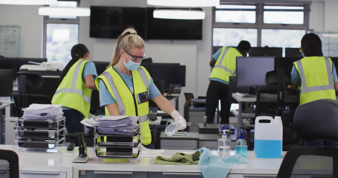 Personnel are actively sanitizing an office space. Female worker uses protective gloves, mask, and vest while cleaning desks with disinfectants. Background shows colleagues participating in similar activities, emphasizing workplace safety and hygiene during the Covid-19 pandemic. Ideal for expressing health protocols, teamwork, pandemic response in workplaces, and materials related to hygiene and safety practices.