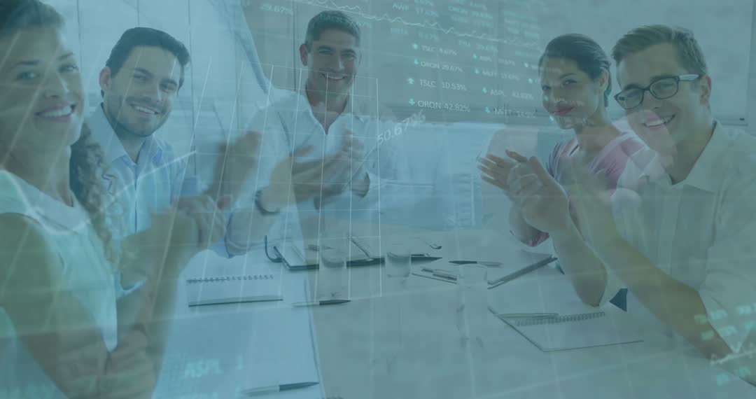 Team of office professionals applauding as a celebration of successful presentation and financial growth. Ideal for use in contexts related to business success, corporate achievements, teamwork and innovation. Perfect for illustrating themes of collaboration and share market analytics in a workplace environment.