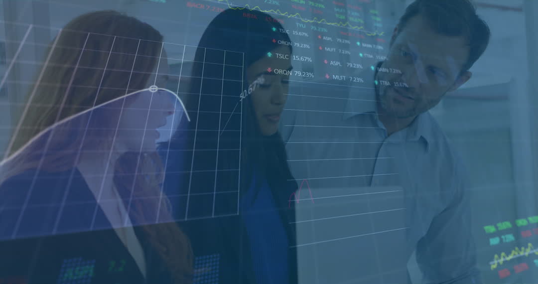 Scene depicts a diverse group of coworkers discussing reports on a laptop, overlayed with animation of graphs and trading data. Ideal for representing corporate teamwork, stock market analysis, or use in financial and business presentations. The multi-exposure effect underscores themes of digital technology integration and modern communication.