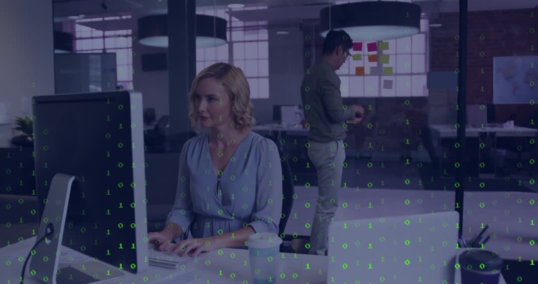 Professionals in a high-tech office environment engage in collaborative tasks. A woman types confidently on a computer, displaying focus and productivity, enhanced by digital graphics and codes. In the background, a colleague organizes sticky notes, demonstrating the balanced blend of digital and physical planning in a corporate workspace. Perfect for marketing materials related to business innovation, collaborative software, or modern workplace solutions.