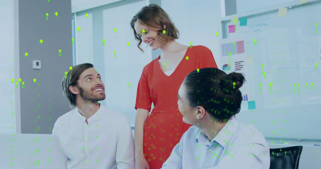 Video depicts a dynamic business environment where colleagues engage in a brainstorming session. Perfect for illustrating teamwork, modern office settings, or collaborative task environments with a technology aspect.