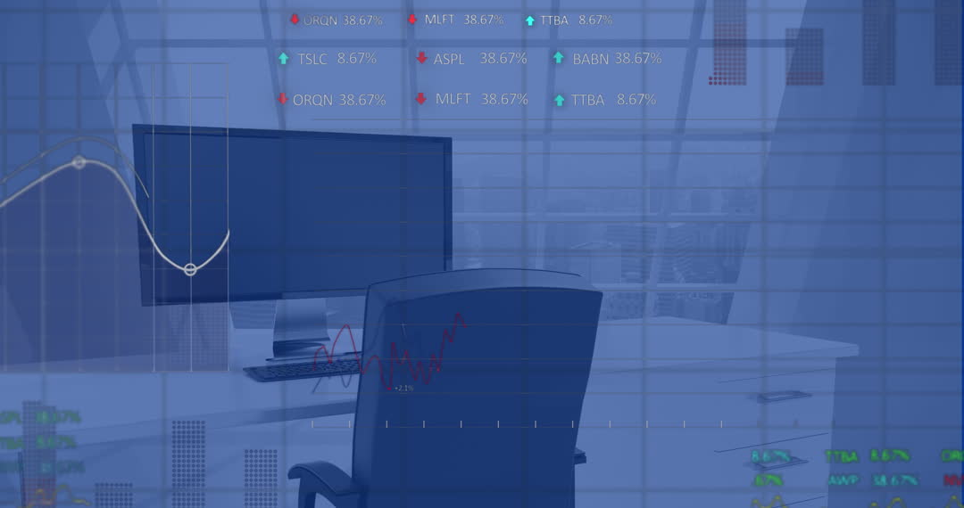 This illustration showcases a modern office equipped with a digital data interface, capturing an ideal environment for financial or business-related tasks. The interface overlay features stock data and graphs, making it perfect for use in business presentations, tech company promos, or financial services marketing material. The cityscape in the background adds a sense of sophistication and urban professionalism, suitable for corporate-themed graphics or backgrounds.