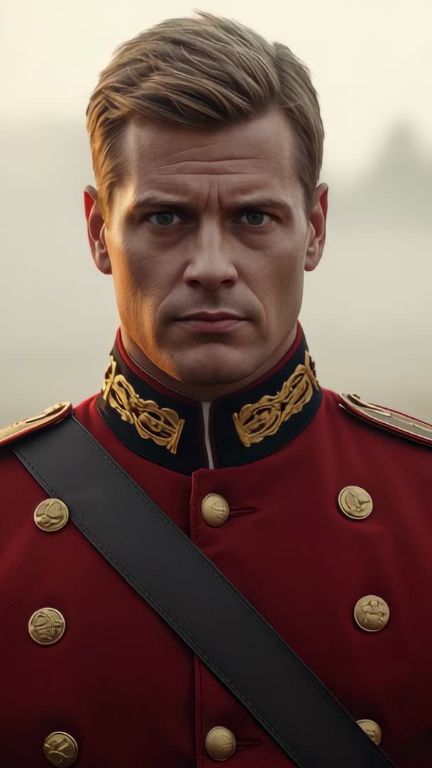 AI Generated Video. Video showing officer holding steady gaze while wearing red tunic with ornate gold embroidery and brass buttons. Soft hazy background and high contrast creating cinematic, authoritative mood. Closeup vertical framing suiting mobile and social platforms, Instagram Reels, TikTok, Snapchat, and vertical web banners. Ideal for historical drama trailers, period series promos, military recruitment campaigns, leadership and discipline editorials, luxury brand campaigns focusing on heritage and tailoring. Clip pairing well with voiceover or orchestral score for storytelling, title sequences, or brand hero visuals. Color grading allowing easy integration into vintage or modern looks, with room for text overlay at top or bottom for captions and branding.