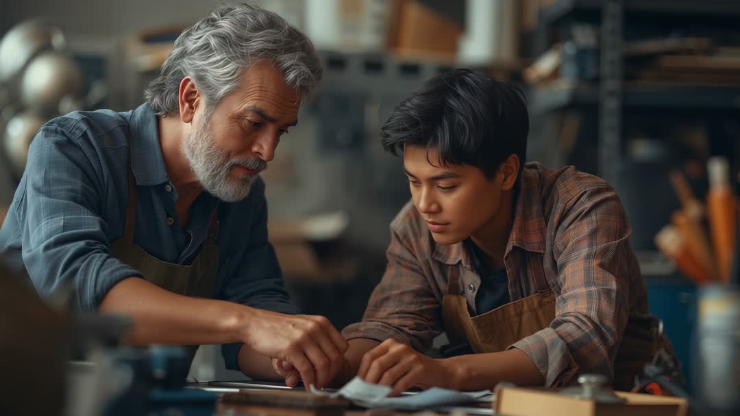 - Older craftsman mentoring young apprentice at workbench, guiding hands over template