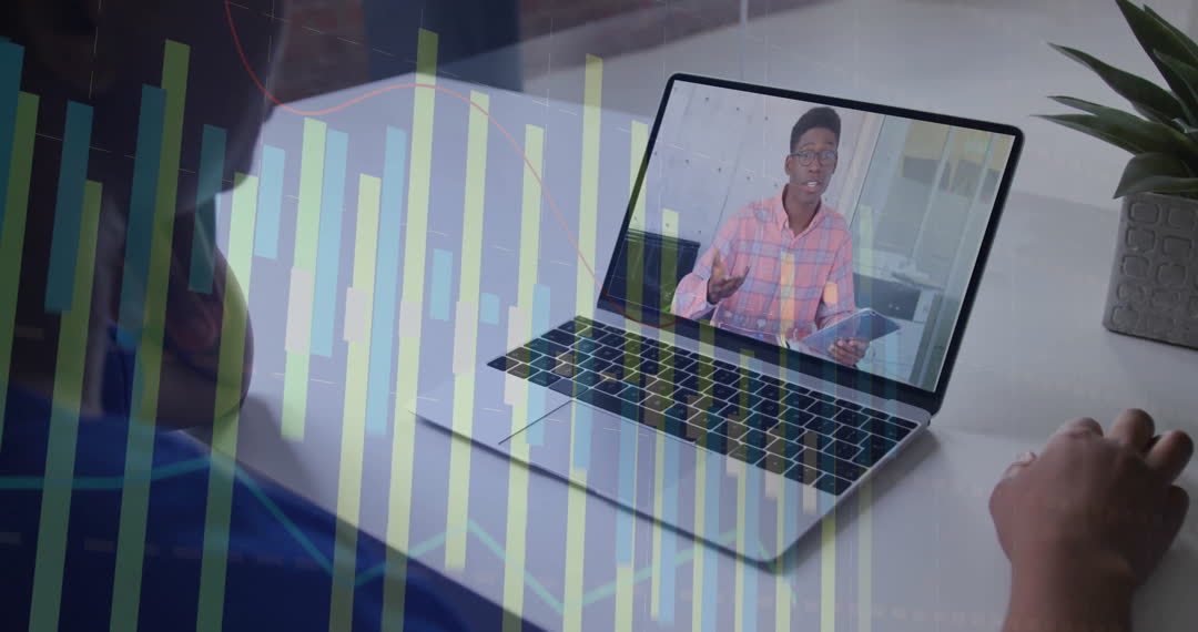 This scene illustrates an individual engaging in an online financial presentation displayed on a laptop. Overlaid with animated charts, it conveys themes of remote learning, virtual business meetings, and incorporating technology in finance. Useful for topics exploring e-learning, finance sectors, or presentations in tech-savvy work environments.
