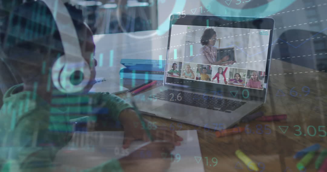 African American boy engaged in online learning on a laptop, with an overlay of financial data streams. This visual juxtaposition symbolizes the intersection of education with digital and financial technology. It represents the modern educational environment where technology and global financial sectors influence learning. Ideal for use in articles or promotions about edtech, remote learning, fintech, or global market impacts on education.