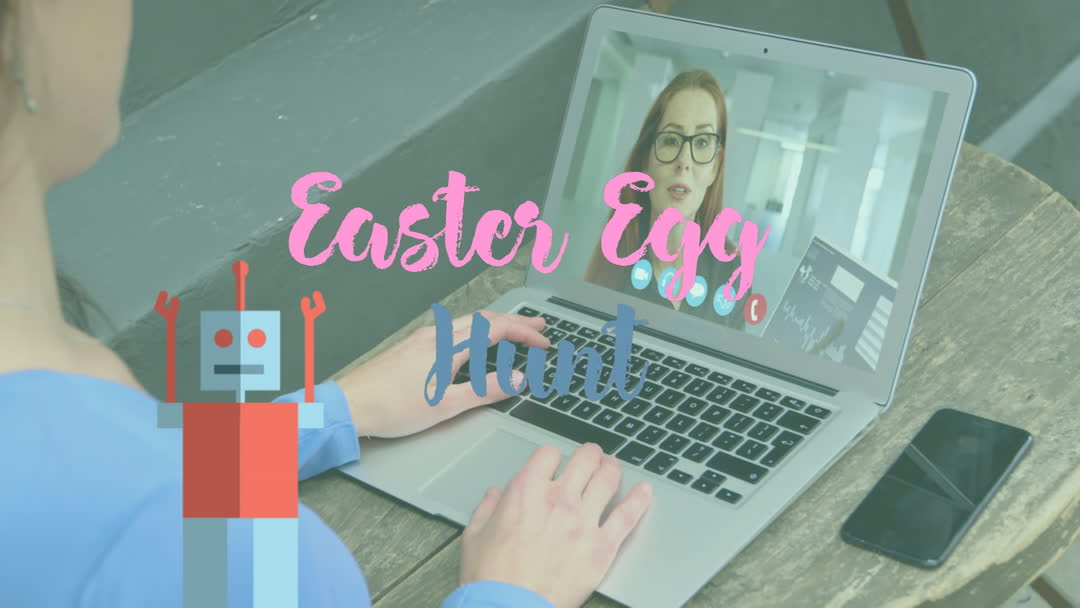 Woman engages in a virtual meeting on a laptop, which represents the rise of remote working and digital communication tools. Bright cartoon robot and 'Easter Egg Hunt' text add colorful graphic elements, suggesting creative themes for online gatherings or events. Useful for publications focusing on remote team's collaboration, advancements in virtual communication technology and creative virtual event concepts.