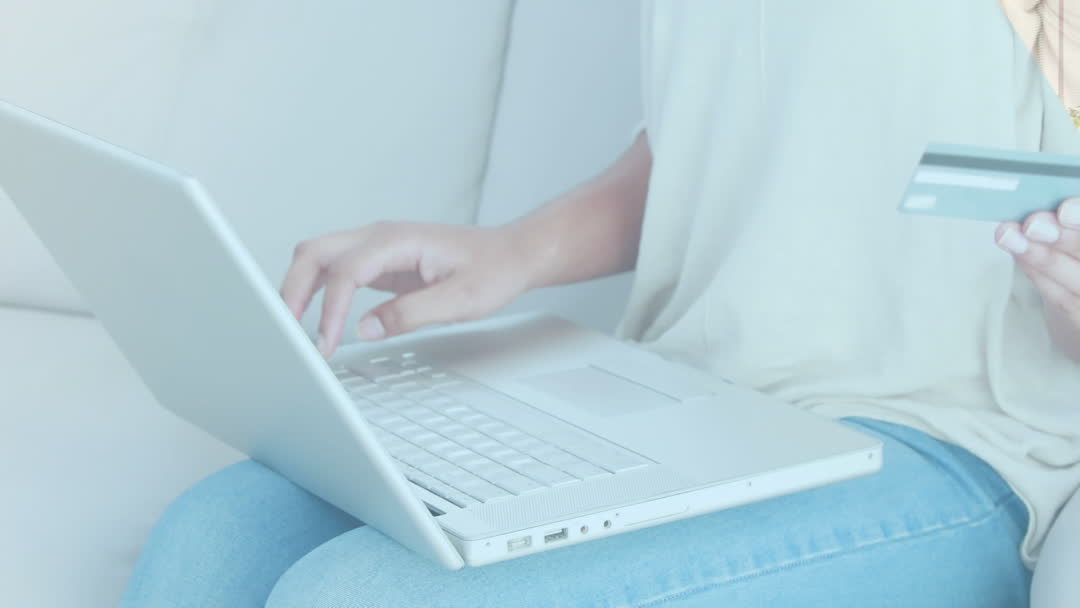 A woman sitting casually using her laptop for online shopping while holding a credit card, symbolizing the convenience and accessibility of e-commerce. Ideal for use in articles or advertisements about online shopping, financial technology, or digital consumer behavior.