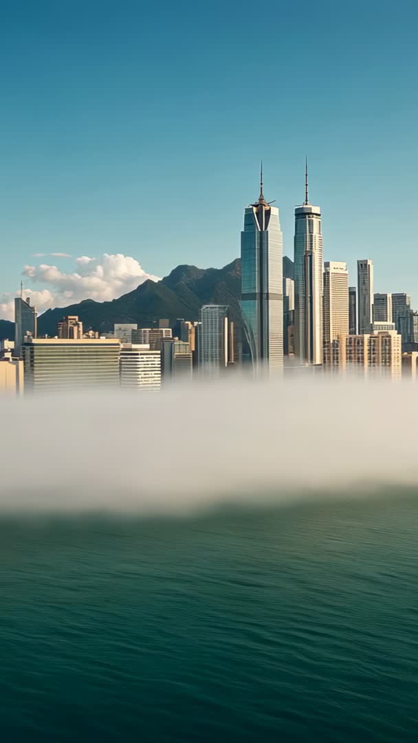 AI Generated Image. Showing twin glass towers rising above low fog while onshore breeze pushing mist across harbor water with mountain ridge framing skyline. Capturing contrast between sleek skyscrapers and soft fog layer, warm daylight reflecting off glass facades. Filming in vertical video format ideal for mobile and social platforms, with smooth slow motion feel and cinematic composition. Suggesting uses: opening shot for travel or tourism videos, backdrop for weather and climate segments, promo clips for waterfront real estate and urban development, atmospheric B-roll for documentaries and corporate videos, vertical hero for Instagram Reels and TikTok ads, mobile wallpaper and screensaver. Providing color graded footage with calm teal water and clear blue sky, allowing easy editing and color matching. Including short loop friendly motion for seamless background use and headline overlays.