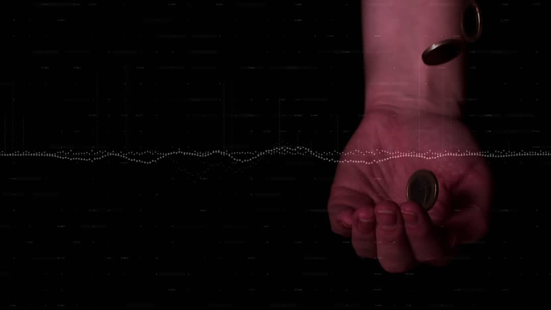 Open Palm Receiving Spinning Coins with Sci-Fi Waveform Abstraction Video