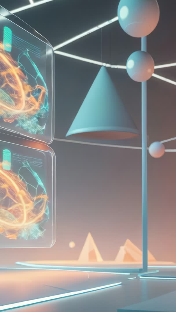 AI Generated Video. Featuring opening holographic panels oscillating with swirling orange-teal energy patterns inside futuristic chamber. Using vertical 9:16 composition optimized for mobile and social platforms. Offering dynamic glowing neon elements, soft depth-of-field, and geometric shapes for sleek tech aesthetic. Suitable for tech promo, app demo, UI mockup, sci-fi trailer, broadcast bumper, mobile ad, and music visual. Ideal for looping motion graphics, title overlays, intro sequences, and background for presentations or product launches. Emphasizing warm orange and cool teal contrast for eye-catching visuals and easy integration with text and logo overlays.