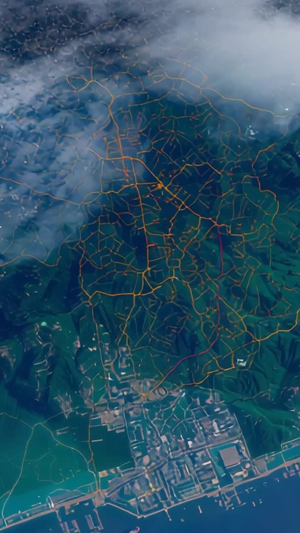 AI Generated Image. Vertical video opening showing coastal port with color-coded ship routes, container terminal and drifting cloud cover. Animated overlay highlighting cargo ship movement, shipping lanes, vessel tracking and port infrastructure against aerial landscape. Ideal for maritime logistics presentations, navigation system demos, supply chain explainers, port operations briefings, weather and traffic news, corporate transport promos and social media reels. Use as intro for documentary, trade show display, client pitch, training module or mobile vertical ad requiring dynamic map visualization. Color palette and animated lines providing clear visual hierarchy for highlighting congestion, route planning and vessel scheduling.