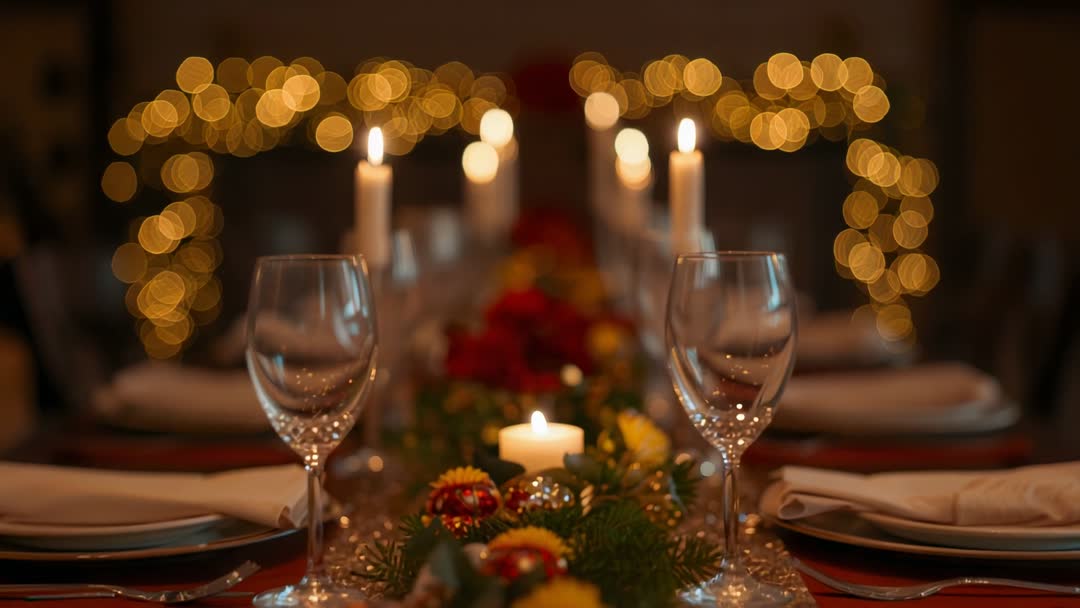 AI Generated Video. Opening video shot following holiday dinner table, showing two crystal wine glasses in foreground, glowing votive candle and tapered candles lined along table, evergreen garland with red floral accents running down center, warm twinkling lights creating soft bokeh background. Cinematic shallow depth of field and soft candlelight creating cozy, intimate ambience, evoking festive celebration and refined entertaining. Use for holiday marketing, restaurant and catering promos, event planning reels, greeting card animations, seasonal social media ads, cinematic openers, lifestyle blog headers, e-commerce banners for tableware and decor. Production tips: use slow pan or gentle rack focus to emphasize glassware, place text or logo over blurred bokeh area, color grade toward warm tones for inviting mood, add subtle ambient sound design such as soft crackling or piano for richer sequence.
