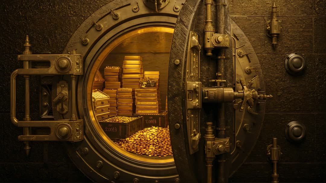 - Opening Vault Door Revealing Stacked Gold Bars, Piles of Coins and Heavy Lock Mechanism