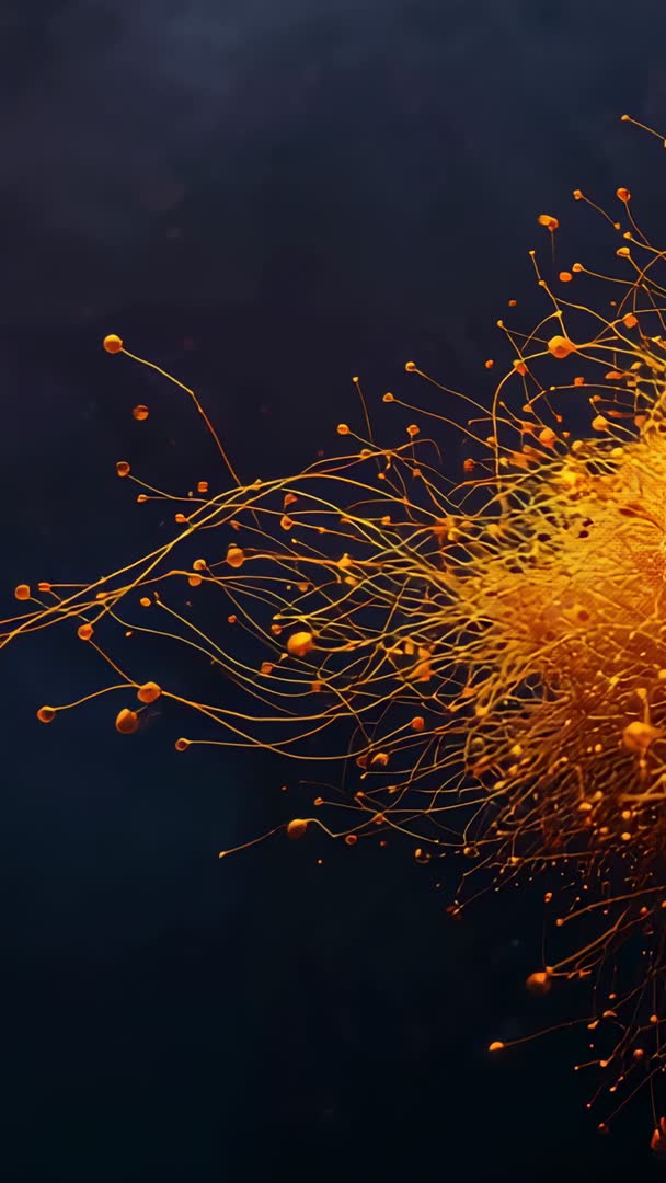 AI Generated Video. Clip showing navy backdrop with intricate orange filaments fanning outward and releasing spherical nodes, creating organic, futuristic motion. Visual combining biological growth and digital particle simulation, evoking microscopic and neural network themes. Suiting tech promo, biotech explainer, science visualization, title sequences, app intros, social media vertical ads, and immersive mobile backgrounds. Working well with loop playback or slow motion for continuous ambient effect. Color palette and abstract composition helping with branding, presentations, concept art, and motion design projects exploring cellular behavior, particle systems, or fluid dynamics.