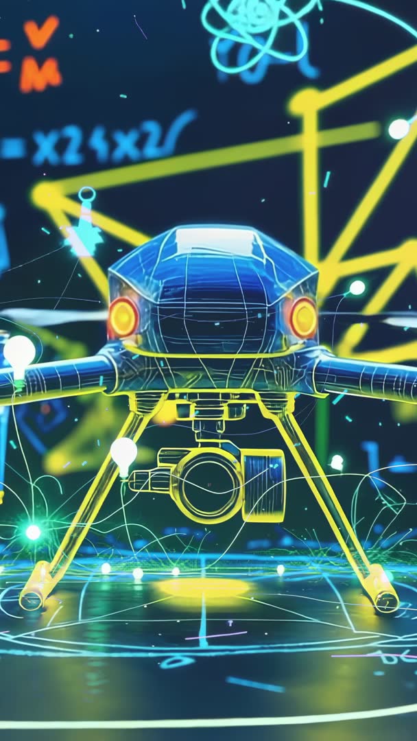 AI Generated Image. Vertical video showing neon-outlined drone hovering above illuminated grid while holographic data nodes projecting from landing platform. Camera pulling back revealing virtual lab environment filled with animated lines, glowing orbs, mathematical formulas floating in background. Color palette featuring electric blue, neon yellow, teal creating high-tech, futuristic mood. Motion elements including subtle camera dolly, particle trails, HUD overlays enhancing sense of depth and interactivity. Usage suggestions: Use as opener for tech conference, product launch, startup pitch. Use as background for app demo, UX walkthrough, AR/VR presentation. Use as vertical social ad for Instagram Reels, TikTok, LinkedIn. Use as visual for educational content on drones, robotics, data science. Use as broadcast bumper, title sequence, trade show loop. Customization tips: Replace HUD text with brand messaging, color grade to match corporate palette, add voiceover or ambient synth soundtrack, overlay lower thirds or CTA buttons. Render loop-friendly segments for seamless playback and adapt framing for 9:16 social platforms.