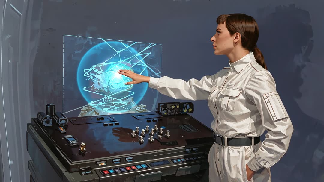 AI Generated Image. Female operator in white jumpsuit interacting with holographic orb above advanced control console, manipulating glowing energy sphere with precise hand gestures. High-tech composition featuring transparent projection panel, illuminated buttons, and industrial console surface, creating cinematic mood and futuristic tone. Suiting corporate technology presentations, AI or cybersecurity articles, sci-fi film and game trailers, UX/UI hero banners, product demo videos, and training materials for control systems. Leaving copy space on left for text overlays, title cards, or lower-third graphics and allowing easy placement of branding or calls to action.