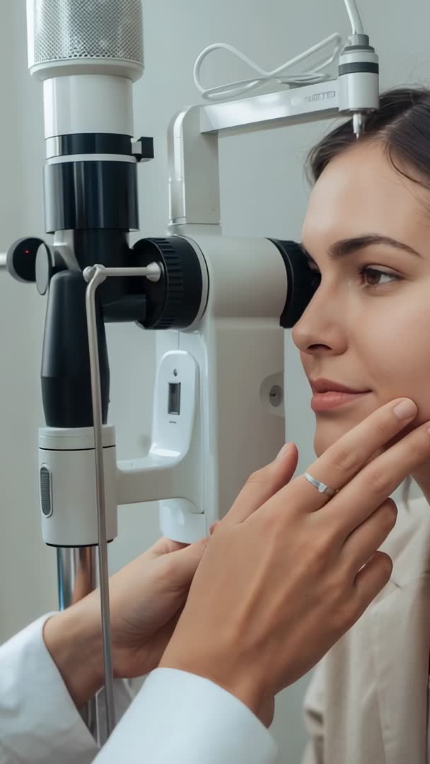 AI Generated Video. Vertical video showing clinician aligning patient at slit lamp while preparing for comprehensive anterior segment exam. Close-up composition capturing patient face, clinician hands adjusting chin rest and eyepiece, and diagnostic instrument controls. Footage emphasizing professional patient interaction, precision instrument setup, and clinical workflow. Useful for medical training clips, ophthalmology clinic marketing, telemedicine tutorials, patient education content, and equipment demonstration reels. Recommended uses include website hero banners, social media reels, e-learning modules, patient intake guides, and conference presentation inserts. Editing suggestions: add voiceover describing exam steps, overlay instructional text and diagrams, include lower-thirds with clinician credentials, and crop for mobile-friendly formats. Visual tone: professional, calm, clinical with neutral color palette and soft lighting to support trustworthy healthcare messaging.