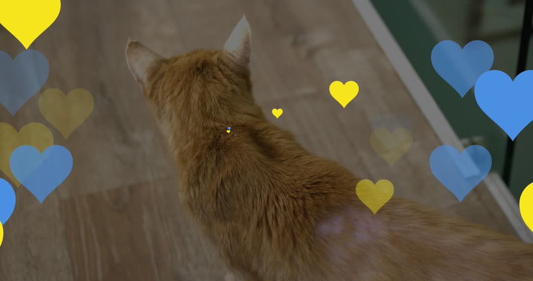 A cute orange cat sits indoors, looking away, surrounded by vibrant yellow and blue heart animations. The combination of warm, cozy vibes with engaging digital accents captures attention. Suitable for use in social media posts about pet care, love for animals, or digital content creations featuring pets.