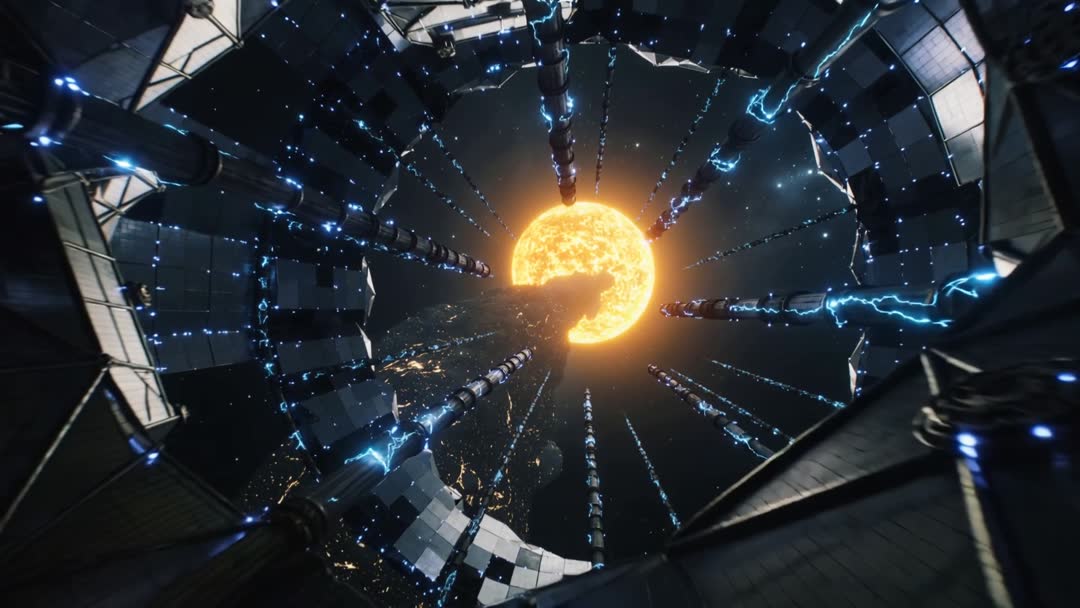 AI Generated Image. Showing cinematic loop of orbital reactor powering up with glowing orange core and metallic radial conduits emitting electric blue arcs. Camera moving upward through cylindrical shaft toward core, revealing distant planet lights beyond. Visual language combining high-tech machinery, neon electricity, and deep space ambience. Motion including pulsing core, traveling energy arcs along conduits, and subtle rotation of ring structures, creating dramatic tension and sense of scale. Color palette balancing warm orange core with cool blue illumination and dark metallic surfaces. Use for title sequences, sci-fi trailers, game cutscenes, technology commercials, corporate innovation promos, livestream backgrounds, museum exhibits, and educational videos about fusion or energy concepts. Suitable for loopable ambient background, motion graphic overlays, or VFX plates for compositing. Recommend pairing with deep bass sound design, synth pads, and percussive impacts to enhance cinematic feel. Provide thumbnails and lower-thirds using radial symmetry to frame on-screen text.