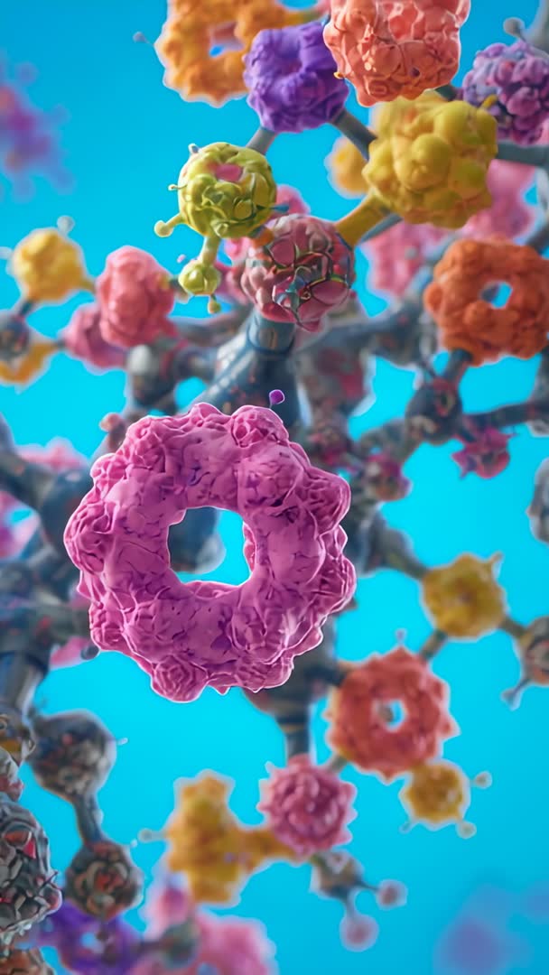 AI Generated Video. Orbiting camera revealing interconnected colorful molecular rings suspended in bright blue space, spotlighting prominent pink torus. Showing intricate surface texture and branching molecular chains for close-up study or cinematic motion. Suited for tech presentations, biotech marketing, laboratory visualization, educational explainer clips, app intros, and social media vertical reels. Providing loopable motion for background use in conference titles, website hero banners, or product demo screens. Delivering modern, playful tone through vibrant palette and smooth camera moves. Available in vertical 9:16 format for mobile-first distribution and short-form content. Compatible with color grading, overlaying text, and adding logo animation to create polished promotional or educational sequences.